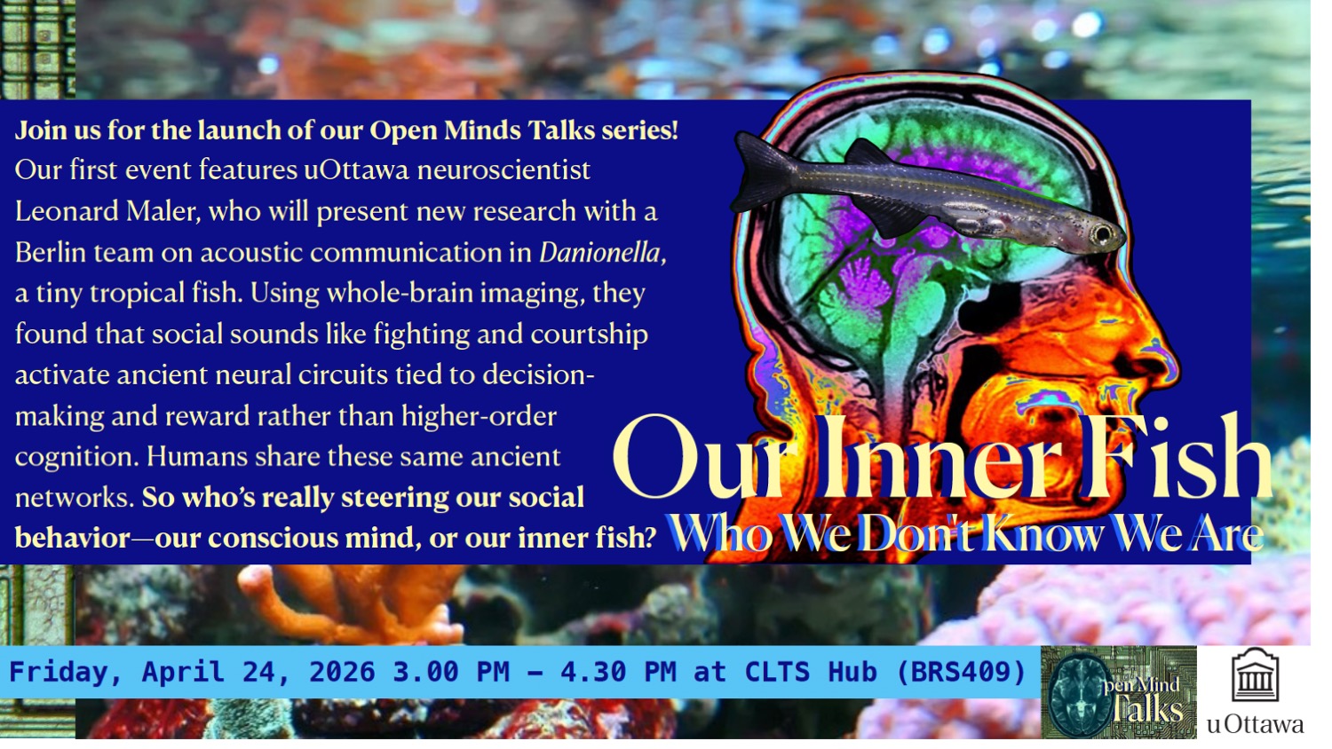 Our inaugural meeting will feature a talk from Professor Leonard Maler, who will present new research with a Berlin team on acoustic communication in Danionella, a tiny tropical fish. using whole-brain imaging, they found that social sounds for fighting and courtship activate ancient neural circuits tied to decision-making and reward, rather than higher-order cognition. Humans share these same ancient networks. So who is really steering our social behaviour - our conscious mind, or our inner fish?